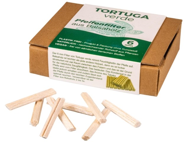 Τα φίλτρα για πίπα καπνού TORTUGA VERDE 6mm Pipe Filters με 68 φίλτρα, απευθύνονται σε πίπες που δέχονται 6mm φίλτρο. Εξωτερικά θυμίζουν την "ψίχα" ενός καλαμιού. Είναι ελαφριά, πορώδες, κρατούν την υγρασία και όλα αυτά διατηρώντας την γεύση και το άρωμα του καπνού στην πραγματική του διάσταση. Με λίγα λόγια είναι ένα κομμάτι ξύλου που μπορεί να μην κατακρατεί τόσες βλαπτικές ουσίες όσο ο ενεργός άνθρακας, όμως το αποτέλεσμα θα είναι η ρεαλιστική απόδοση των αιθεριων ελαίων με τέτοιο τρόπο που θα σας εντυπωσιάσει.