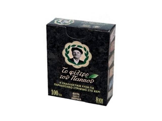 Τα φιλτράκια στριφτού Του Παππού ενεργού άνθρακα έχουν κανονικό μέγεθος 8mm. Ο ενεργός άνθρακας έχει την ιδιότητα να φιλτράρει περισσότερες βλαπτικές ουσίες από τα απλά φιλτράκια. Η κάθε συσκευασία περιέχει 100 χύμα φιλτράκια.