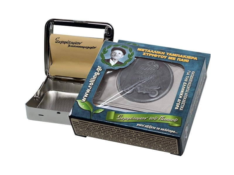 Η μηχανή στριφτού του παππού Rolling  47302-770 ΑΕΤΟΣ & ΜΗΧΑΝΗ είναι μεταλλική ταμπακιέρα που μπορεί να στρίψει το αγαπημένο σας στριφτό, αλλά και να αποθηκεύσετε σε αυτήν καπνό ή τα σύνεργα σας. Διαθέτει υφασμάτινο πανάκι για καλύτερο αποτέλεσμα και είναι ιδανική για όλα τα στριφτά.