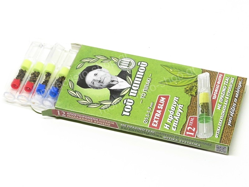 Το πιπάκι τσιγάρου του Παππού 42902-262 ΜΕ ΠΡΑΣΙΝΟ ΤΣΑΪ, ΦΥΣΙΚΑ ΕΚΧΥΛΙΣΜΑΤΑ ΚΑΙ 4 ΥΓΡΟΠΑΓΙΔΕΣ EXTRA SLIM 5.5mm-5.7mm, διαθέτει υδρόφιλο φίλτρο με υγροπαγίδα, είναι μικρό σε μέγεθος, περιέχεται σε πακετάκι των 12 τεμαχίων και μπορείτε να το χρησιμοποιήσετε για μερικές χρήσεις, έως ότου να μαυρίσει το εσωτερικό του ή να αλλάξει η γεύση του τσιγάρου σας.