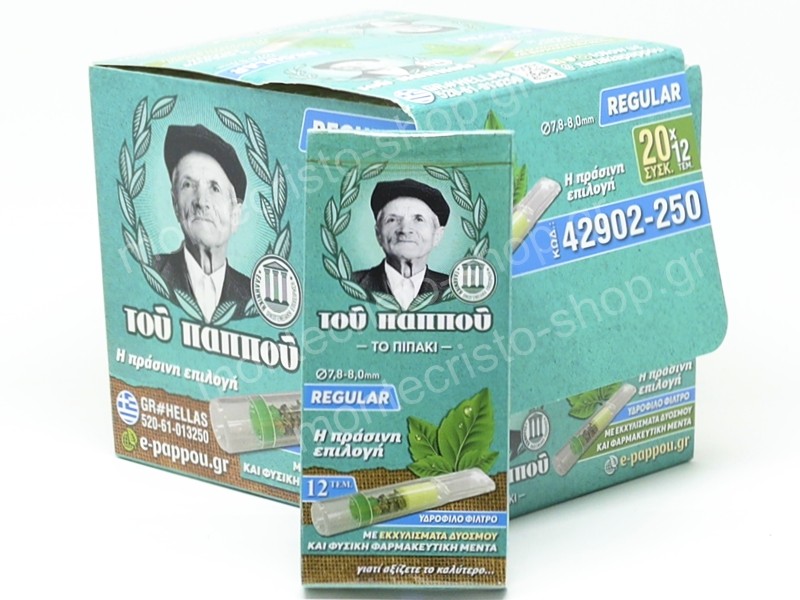 Το πιπάκι τσιγάρου του Παππού 42902-250 ΜΕ ΕΚΧΥΛΙΣΜΑΤΑ ΔΥΟΣΜΟΥ, ΦΥΣΙΚΗ ΦΑΡΜΑΚΕΥΤΙΚΗ ΜΕΝΤΑ ΚΑΙ 4 ΥΓΡΟΠΑΓΙΔΕΣ REGULAR 7.8mm-8mm, διαθέτει υδρόφιλο φίλτρο με υγροπαγίδα, είναι μικρό σε μέγεθος, περιέχεται σε πακετάκι των 12 τεμαχίων και μπορείτε να το χρησιμοποιήσετε για μερικές χρήσεις, έως ότου να μαυρίσει το εσωτερικό του ή να αλλάξει η γεύση του τσιγάρου σας.