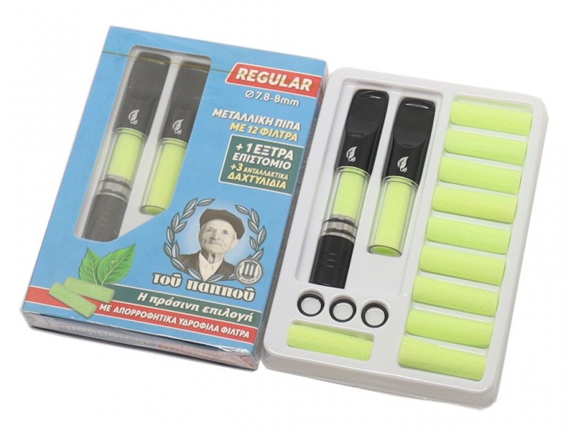 Η πίπα τσιγάρου του παππού 42907-200 REGULAR (7.8mm, 8mm) είναι μεταλλική, περιέχει έξτρα επιστόμιο, είναι συμβατή με στριφτά τσιγάρα που περιέχουν regular φίλτρο, είναι απεριόριστων χρήσεων και η συσκευασία περιέχει 12 ανταλλακτικά φίλτρα και ένα επιπλέον επιστόμιο. Είναι φτιαγμένη από χρώμιο και βακελίτη, έχει χρώμα μαύρο και επιστόμιο μαύρο.