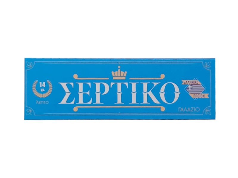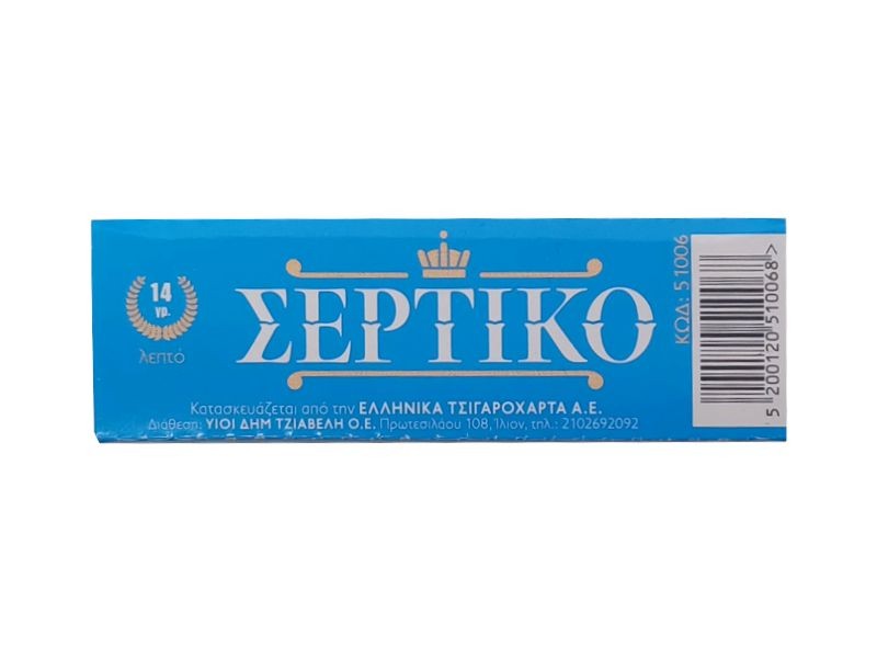 Τα χαρτάκια Σέρτικο κατασκευάζονται στην Ελλάδα και είναι εγκεκριμένα το Γερμανικό οργανισμό τροφίμων και καπνού TVO. Δεν περιέχουν καθόλου χλώριο και έχουν πιστοποίηση TCF ( Totally Chlorine Free). Έχουν προειδοποιητική ένδειξη στα 10 χαρτάκια πριν το τέλος για μην ξεμείνετε.