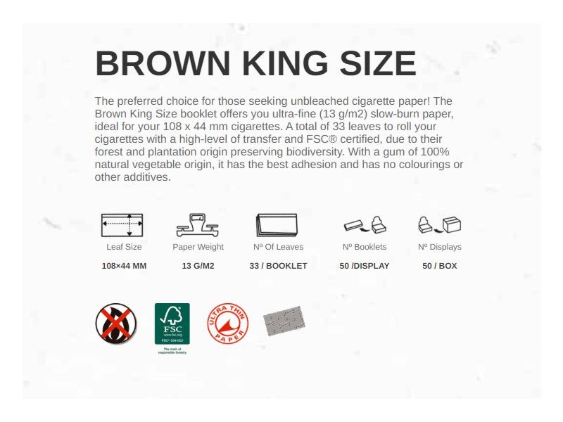 - Τα χαρτάκια στριφτού Smoking BROWN King Size 33 Unbleached περιέχουν 33 φύλλα, είναι μια από τις τελευταίες δημιουργίες της εταιρίας Smoking, και επιλέγονται από καπνιστές που θέλουν ένα ποιοτικό λεπτό βραδύκαυστο ρυζόχαρτο για αργό απολαυστικό κάπνισμα.