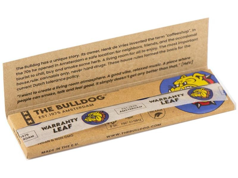 Τα χαρτάκια στριφτού THE BULLDOG KING SIZE NATURAL ECO διαθέτουν μεγάλο μέγεθος και λεπτό πάχος. Σε κάθε φύλλο χαρτιού υπάρχει ειδικό υδατογράφημα το οποίο βοηθάει στην ομοιόμορφη καύση. Είναι φτιαγμένα από πολτό ινδικής κάνναβης και η κόλλα τους είναι αραβική.