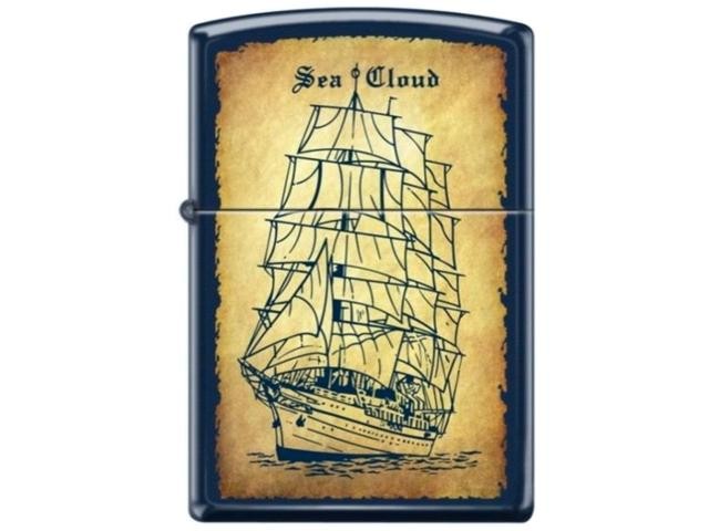 Ο γνήσιος αντιανεμικός αναπτήρας ZIPPO 239 SEA CLOUD είναι σε χρώμα μπλε και διαθέτει ως σχέδιο ένα καράβι.